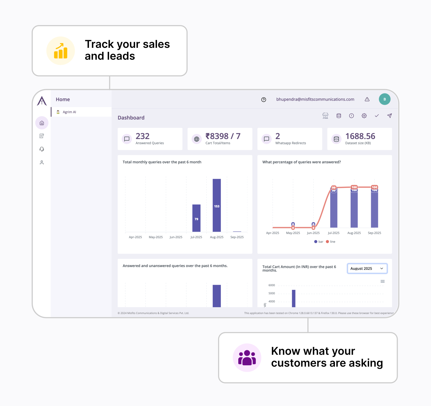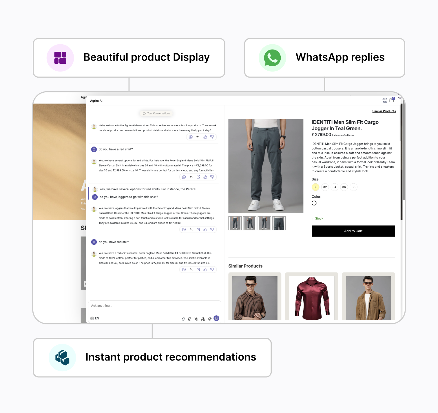 Agrim's AI Agent delivers brand-aligned conversations, resolving 60% of support inquiries and increasing conversions 2.5x with tailored recommendations.