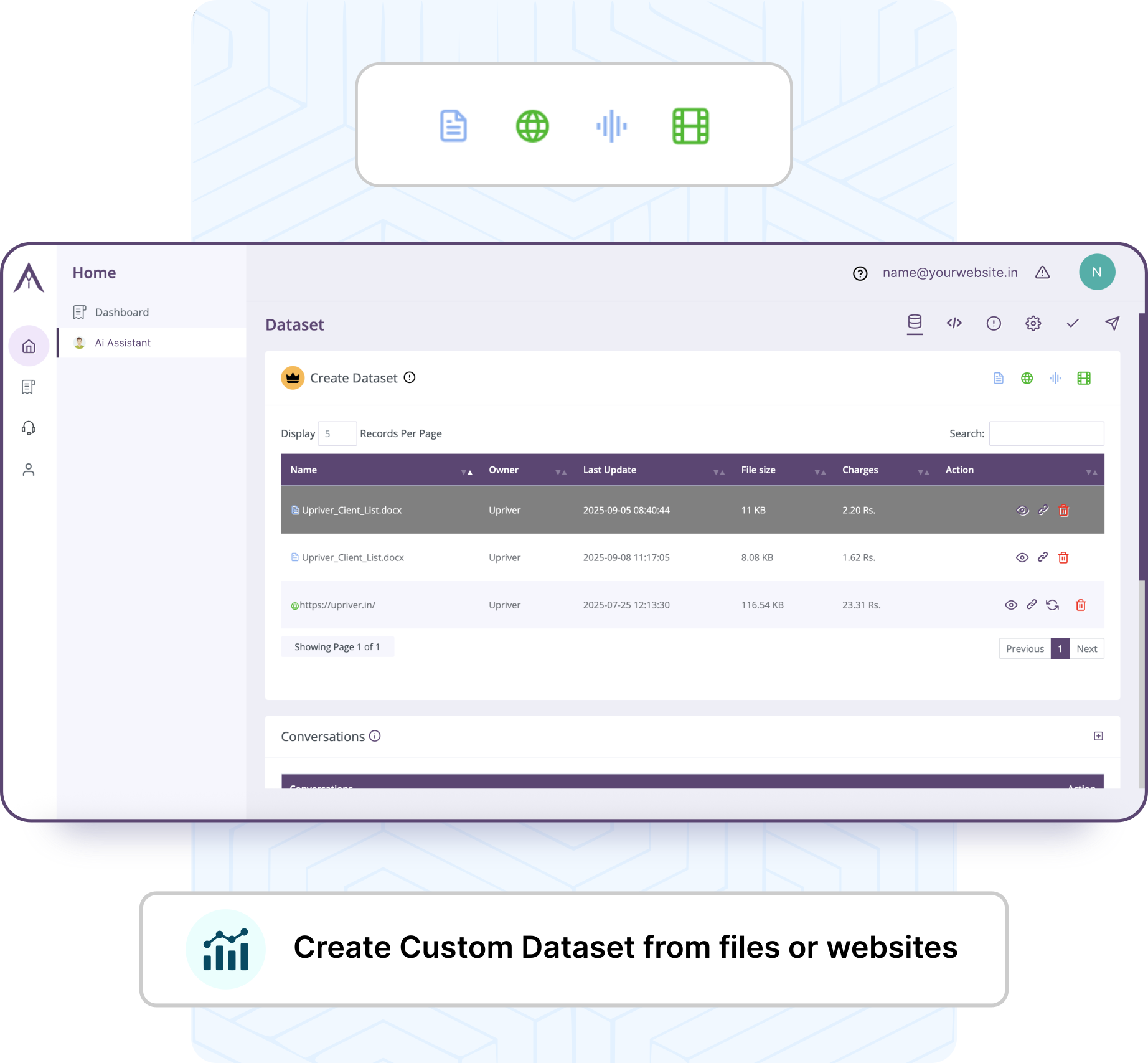 Create a dataset for your assistant using your website, FAQ in pdf, word or text files, advertising audio or videos.Agrim will crawl your website and pull content from yourwebsite automatically. No designing flows and creating responses. Create your assistant in under 10 minsThe assistant will make responses to your customerqueries only from your dataset.