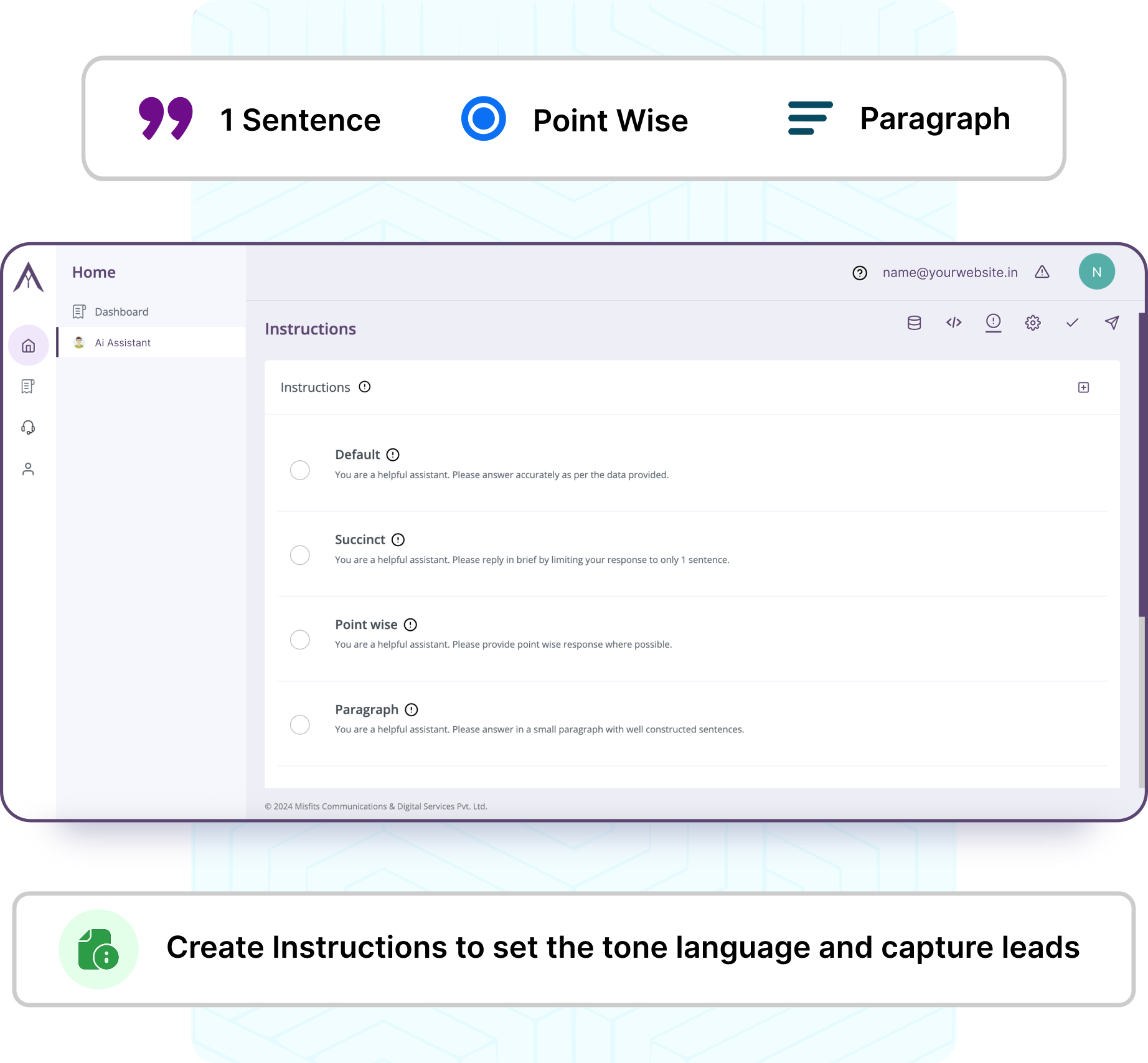 You can create your own instructions for your assistant , e.g. keep the language and tone formal or give succinct responses. But it goes beyond this, you can instruct your assistant to intelligently assess the user’s intent and show him a form to capture his details for a call back or receiving more information. It is bit like training your assistant to comply with the brand ethos