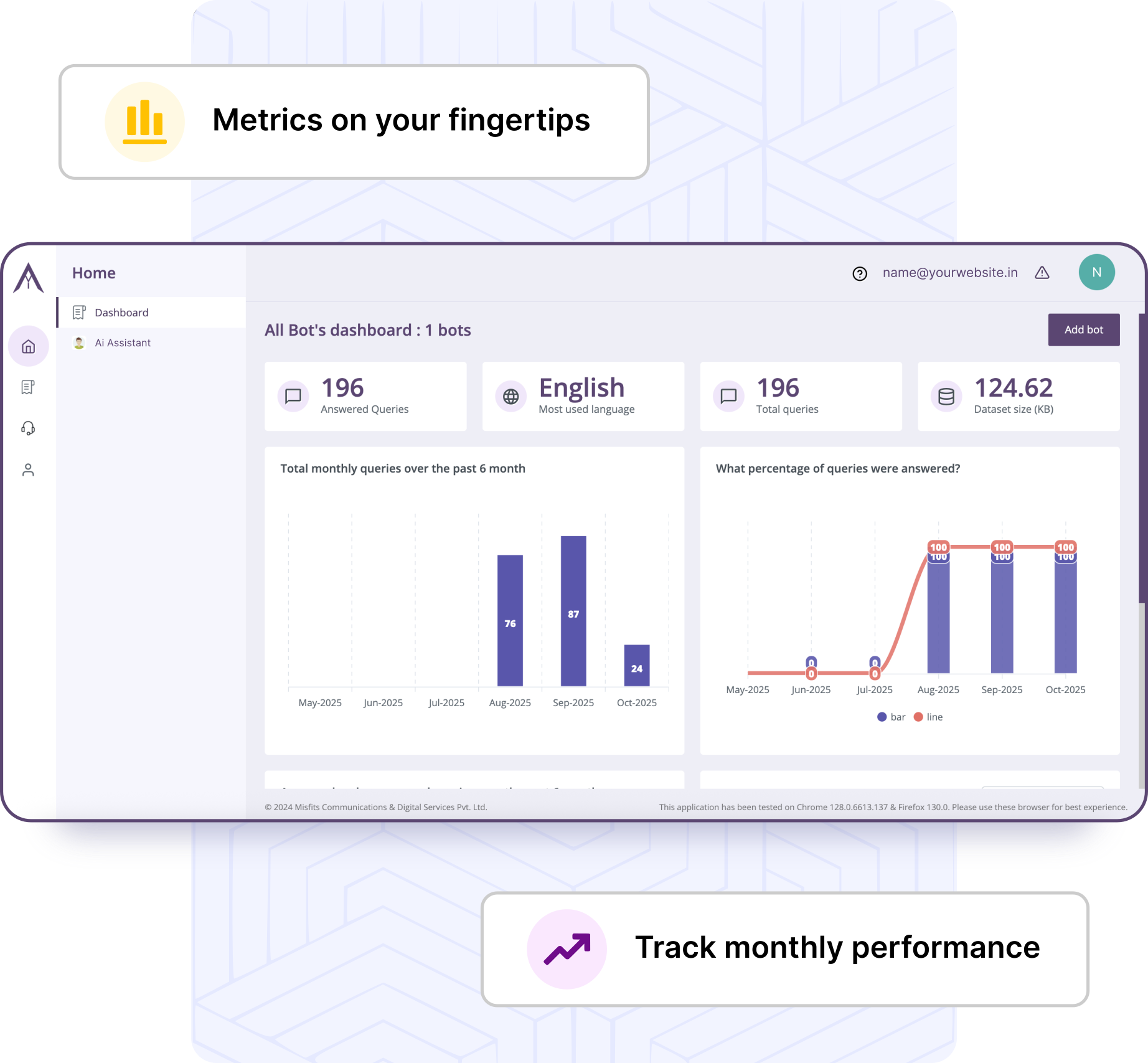 The Agrim dashboards gives you the performance of your assistants in a snapshot from queries tackled in previous months, leads generated, queries answered, their responses and the ability to edit those responses if needed. It also gives an insight into languages people are using the assistant in so that you can tweak your content or website to better cater to your customer’s needs.