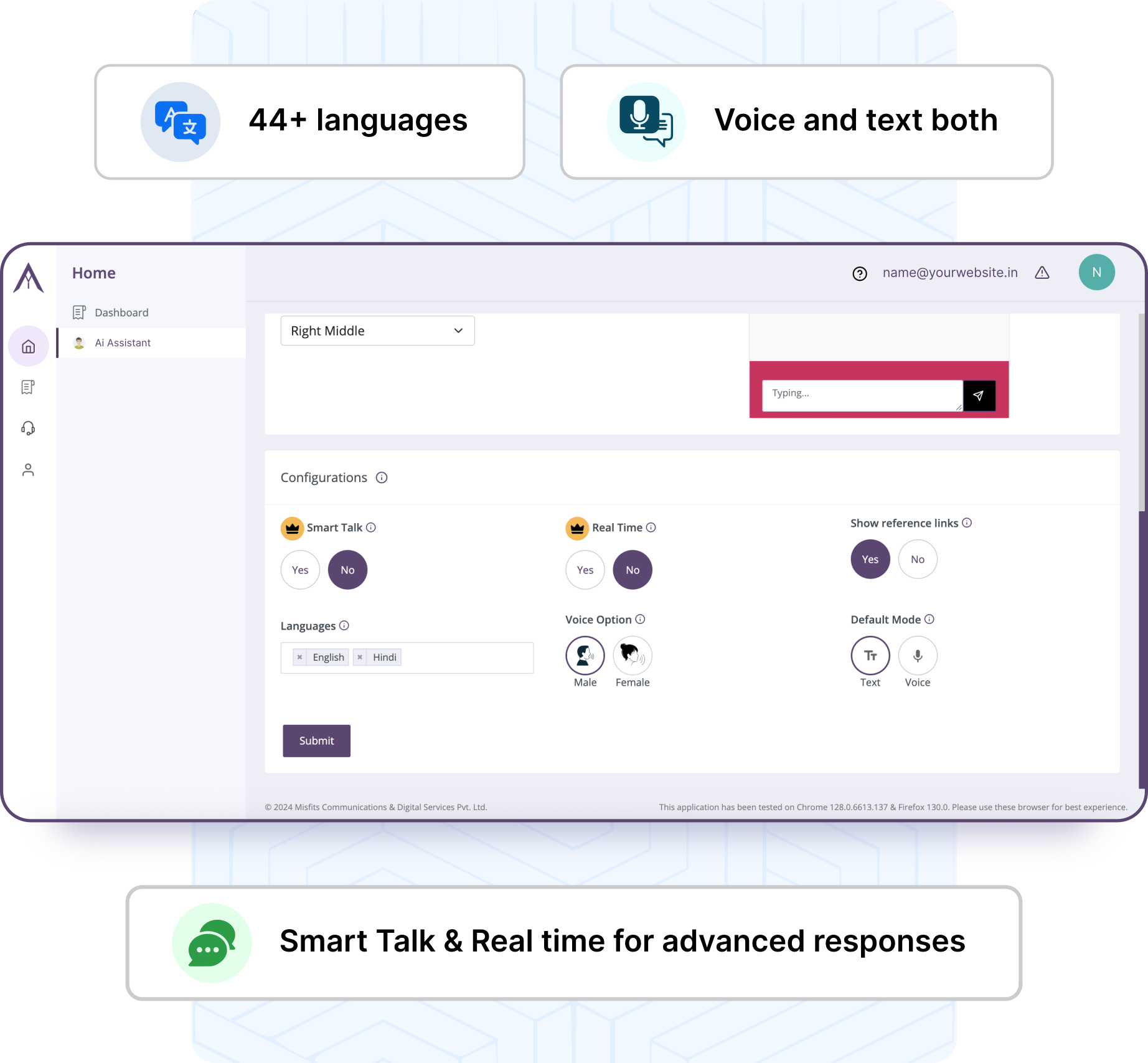 The advanced setting of “Smart Talk” allows the assistant to respond to user queries outside of your dataset, effectively ensuring an appropriate response to all user queries and turning on the “Real Time” setting allows the assistant to respond from latest information on a subject. Select from 44+ Indian and international languages for your assistant to respond in voice or text.